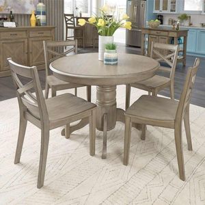 Rustic casual design that is at home in a mountain lodge, as it is in a mid-town loft. Table is crafted of hardwood solids and engineered woods. Top is wire brushed to provide a rough-hewn look. Finished in a multi-colored gray that provides unique high lighting to the design. Carved pedestal base with four shaped feet to provide stability. Chairs have veneered shaped seat with back featuring a curved “x” frame. Front, side, and back stretchers, for added stability. Arrives to your door by parcel delivery service. Note finish and measurements may vary, assembly required. Table: W-42”, D-42”, H-30; Chair: W-18”, D-20 ¾”, H-34 ½”.