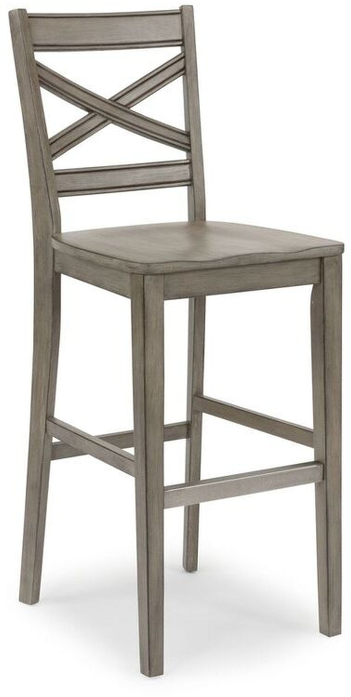 Rustic casual design that is at home in a mountain lodge, as it is in a mid-town loft. Crafted of Hardwood solids and veneers with engineered woods. All surfaces are wire brushed to provide a rough-hewn look. Finished in a multi-colored gray that provides unique high lighting to the design. Front stretcher bar is covered in antiqued nickel finished metal to protect from shoe scraps. With side and back stretchers for added stability. Shaped seat with the back featuring a curved “x” frame. Note finish and measurements may vary, assembly required. W-18”, D-20 ¾”, H-46 ¾”.