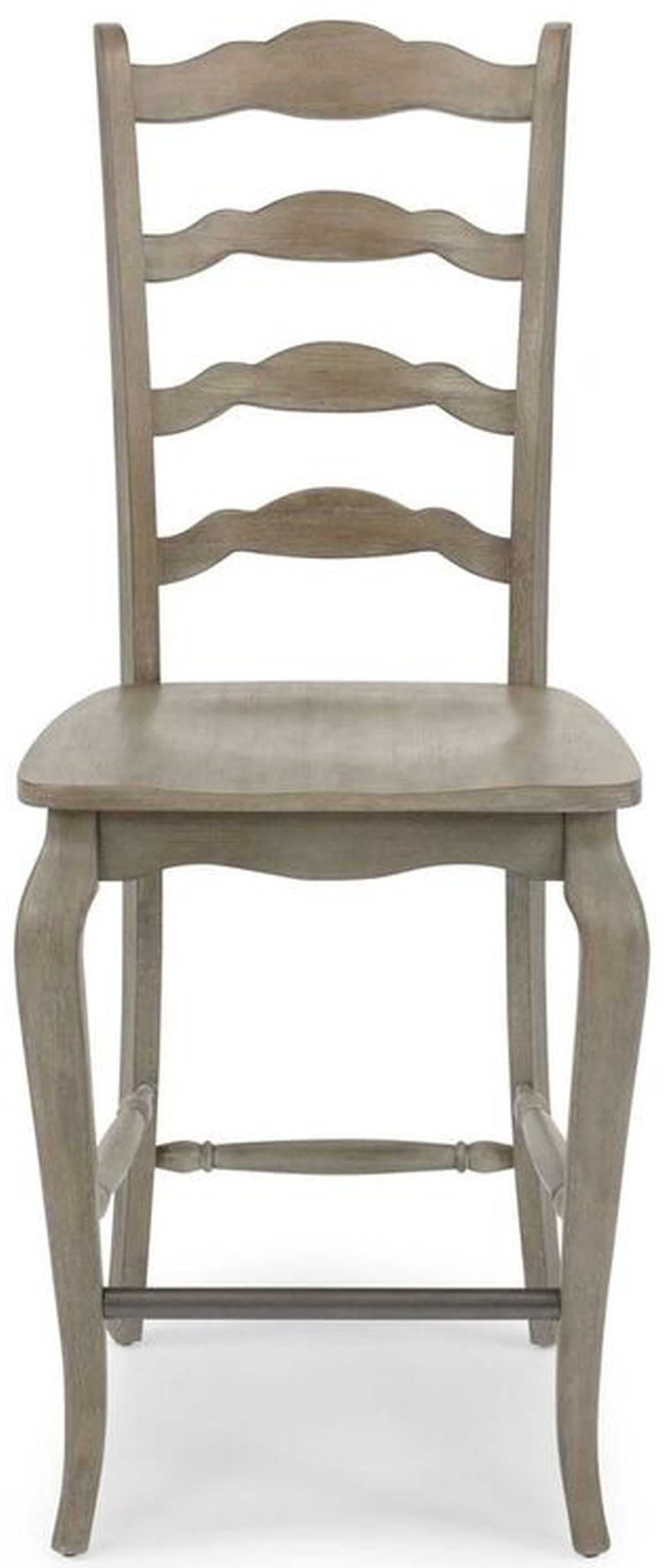 Rustic casual design that is at home in a mountain lodge, as it is in a mid-town loft. Crafted of poplar and oak solids with hardwood veneers and engineered woods. All surfaces are wired brushed to provide a rough-hewn look. Finished in a multi-colored gray that provides unique high lighting to the design. Craved front cabriole legs, with connecting stretcher bar covered in antiqued nickel finished metal to protect from shoe scraps. Curved ladder back, with shaped seat for comfort. Note finish and measurements may vary, assembly required. W-18 ½”, D-22 ¼”, H-46 ¼”.