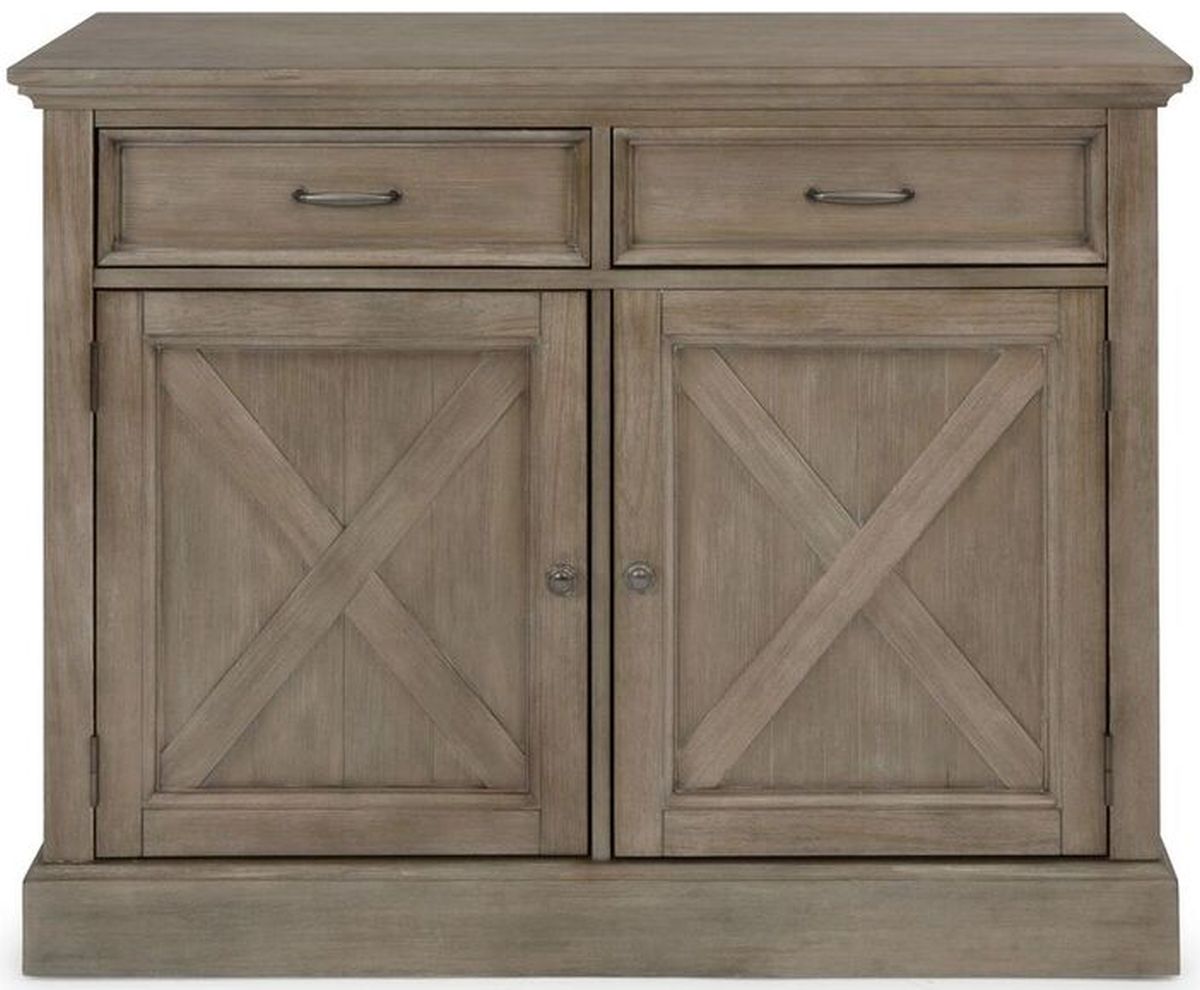 Rustic casual design that is at home in a mountain lodge, as it is in a mid-town loft. Crafted of poplar solids and hardwood veneers with engineered woods, that features solid wood “X” frame design, with inset wainscot panels, with all surfaces wired brushed to provide a rough-hewn look. Finished in a multi-colored gray that provides unique high lighting to the design. Two upper drawers and two lower doors open to two adjustable shelves in each area, providing maximum storage space. Door and drawer pulls are antiqued nickel finished. Note finish and measurements may vary, assembly required. W-47”, D-18”, H-36 ¼”.