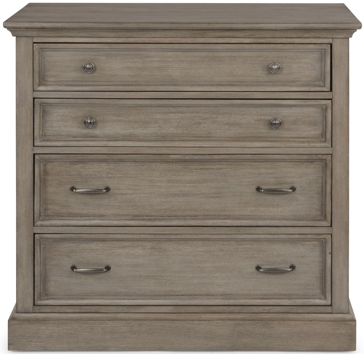 Drawers are framed and feature antiqued nickel finished drawer pulls.