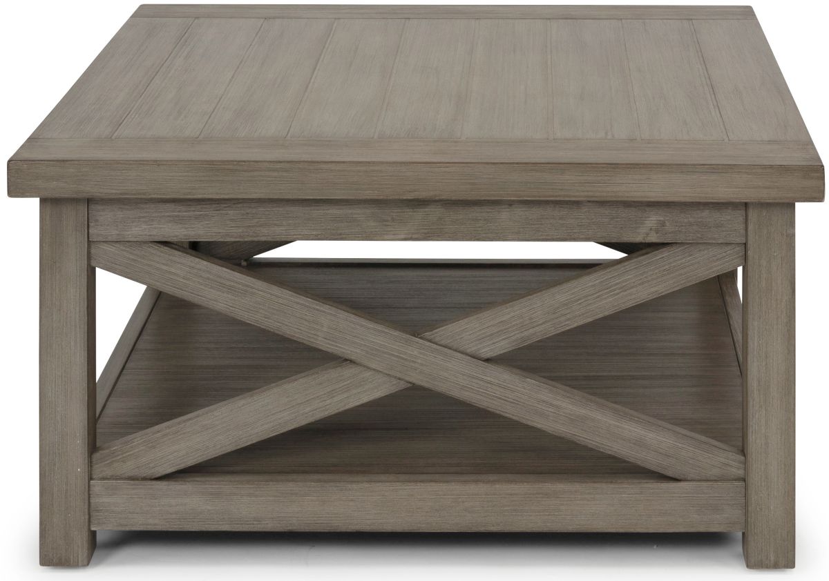 Rustic casual design that is at home in a mountain lodge, as it is in a mid-town loft. Crafted of mahogany solids and veneers with engineered woods, that features solid wood “X” frame design, with all surfaces wired brushed to provide a rough-hewn look. Finished in a multi-colored gray that provides unique high lighting to the design. The top features a framed plank top, with a lower storage shelf. Note finish and measurements may vary, assembly required. W-36”, D-36”, H-18”.