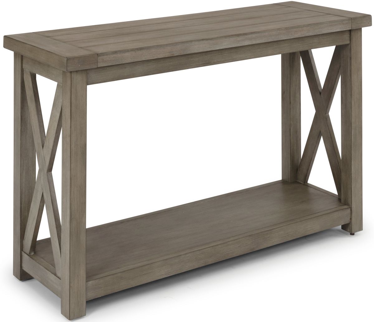 Rustic casual design that is at home in a mountain lodge, as it is in a mid-town loft. Crafted of mahogany solids and veneers with engineered woods, that features solid wood “X” frame design, with all surfaces wired brushed to provide a rough-hewn look. Finished in a multi-colored gray that provides unique high lighting to the design. The top features a framed plank top, with a lower storage shelf. Arrives to your door by parcel delivery service. Note finish and measurements may vary, assembly required. W-48”, D-17”, H-30”.