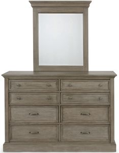 Rustic casual design that is at home in a mountain lodge, as it is in a mid-town loft. Crafted of mahogany solids and veneers with engineered woods, that features solid wood “X” frame design, with inset wainscot panels, with all surfaces wired brushed to provide a rough-hewn look. Finished in a multi-colored gray that provides unique high lighting to the design. The top 2 drawers feature felt lined bottoms to protect delicate items. Drawers are framed and feature antiqued nickel finished drawer pulls. The Mirror features beveled glass, wood mounting bars to attach to the dresser, or has brackets for hanging on the wall. Arrives to your door by parcel delivery service. Note finish and measurements may vary, assembly required. Dresser: W-54”, D-18 ¾”, H-36”; Mirror: W-32”, D-3”, H-36”.