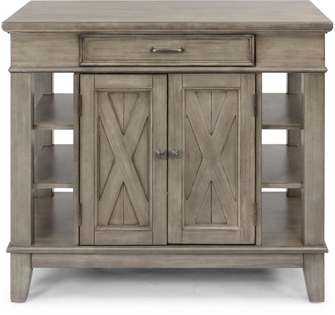 Rustic casual design that is at home in a mountain lodge, as it is in a mid-town loft. Crafted of hardwood solids and engineered woods, that features solid wood “X” frame design, with inset wainscot panels, with all surfaces wired brushed to provide a rough-hewn look. Finished in a multi-colored gray that provides unique high lighting to the design. Features a center storage area accessible from both sides by 2 doors on each side, with a full-length adjustable shelf. A single pass through drawer is also accessible from both sides. Antiqued nickel finished door and drawer pulls. Two fixed shelves on each side provide additional storage space. Arrives to your door by parcel delivery service. Note finish and measurements may vary, assembly required.