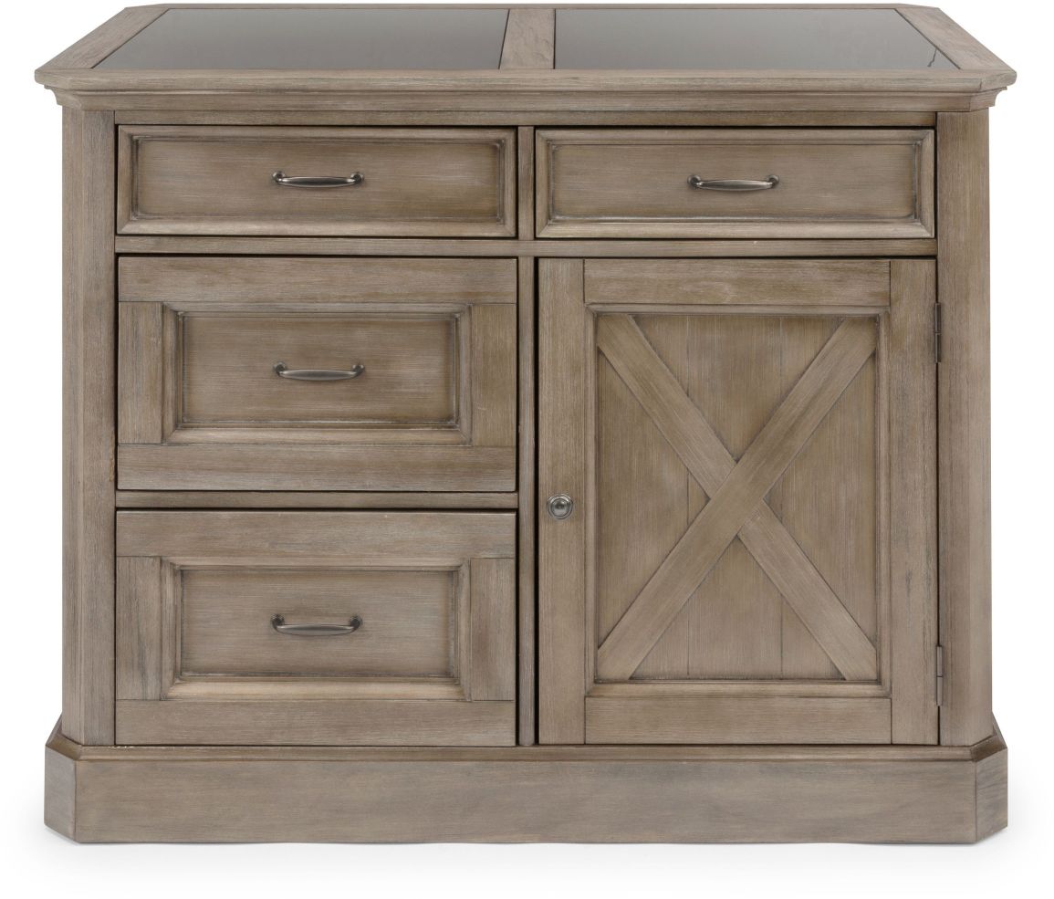 Rustic casual design that is at home in a mountain lodge, as it is in a mid-town loft. Crafted of poplar solids and hardwood veneers with engineered woods, that features solid wood “X” frame design, with inset wainscot panels, with all surfaces wired brushed to provide a rough-hewn look. Finished in a multi-colored gray that provides unique high lighting to the design. The top features two ¾” thick granite insets, with wood framing. Four drawers with antiqued nickel finished drawer pulls. A single door that has two adjustable shelves behind. The back of the unit features a kneehole area for stools. Note finish and measurements may vary, assembly required. W-47”, D-30”, H-36”.