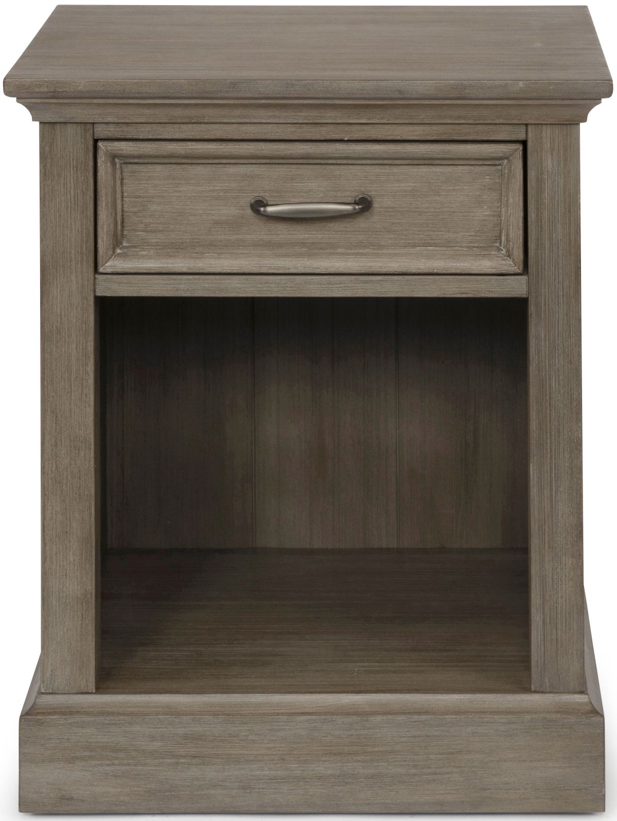 Rustic casual design that is at home in a mountain lodge, as it is in a mid-town loft. Crafted of mahogany solids and veneers with engineered woods, that features solid wood “X” frame design, with inset wainscot panels, with all surfaces wired brushed to provide a rough-hewn look. Finished in a multi-colored gray that provides unique high lighting to the design. The drawer is framed and feature antiqued nickel finished drawer pull, with a large open storage area below. Note finish and measurements may vary, assembly required.