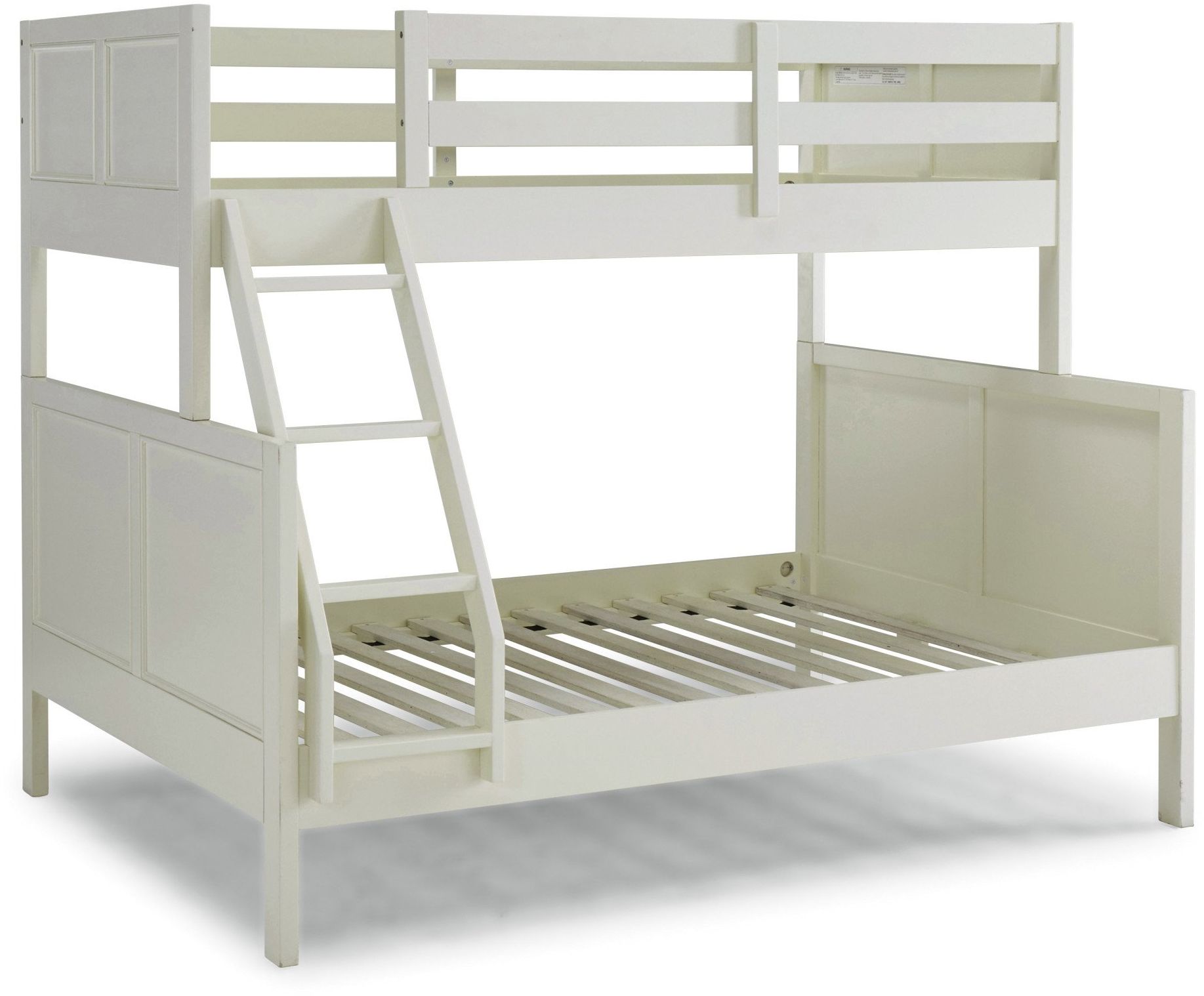 Naples white twin bed over full bunk bed is transitional design that works in any décor. Crafted of solid hardwoods, laminated veneer lumber, and engineered woods, finished in an off-white satin painted finish. Laminated veneer lumber is a construction grade product used to make beams for framing and is stronger and more durable than solid wood. It is used in key areas for added strength and safety. Bed includes angled side ladder that attached to the lower and upper side rails for easy access to top bunk, and includes slates for mattress support. Lower bunk is sized for standard, full size mattress and the upper bunk for twin size mattress, mattresses not included. Duel frame paneled headboard and footboard for added design element with dual rail upper bunk side protection for safety and stability.