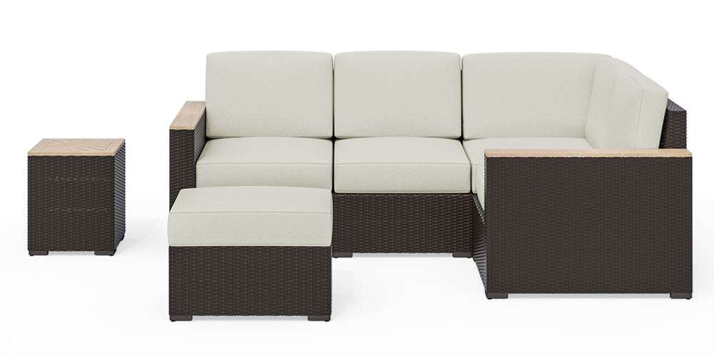 Instantly transform any size patio, balcony or deck area into an inviting, comfortable haven with this Palm Springs collection four-seat sectional, ottoman, and table. Built for indoor or outdoor use, every element is built to withstand the elements, from the weather-resistant rattan to the fade-free cushion fabric. Cozy cushions deliver lasting comfort and the covers easily unzip to clean. An ottoman with cushioned top is a great place for your feet or for another short-term seating spot. Easily bring the sectional elements into a tight configuration, or change your mind and quickly reconfigure. The Acacia table top is naturally resistant to water and fading, keeping it looking great season after season. Combine other Palm Springs collection items to complete your vision for the great outdoors. 4-Seat Sectional measures 33"H x 84.25"W x 60.25"D. Ottoman measures 18"H x 24"W x 18"D. Table measures 18"H x 15"W x 15"D.Read More