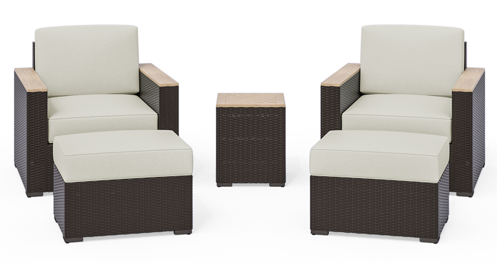 Instantly transform any size patio, balcony or deck area into an inviting, comfortable haven with this Palm Springs set consisting of two chairs, two ottomans, and a table. Perfect for indoor or outdoor use, each piece is built to withstand the elements, from the weather-resistant rattan to the fade-free cushion fabric. Cozy cushions deliver lasting comfort and the covers easily unzip to clean. Solid acacia wood arms combine style and durability to keep your outdoor refuge looking sharp season after season. The Acacia table top is naturally resistant to water and fading, keeping it looking great season after season. Combine other Palm Springs collection items to complete your vision for the great outdoors. Chair measures 33"H x 32.5"W x 32"D. Table measures 18"H x 15"W x 15"D. Ottoman measures 18"H x 24"W x 18"DRead More