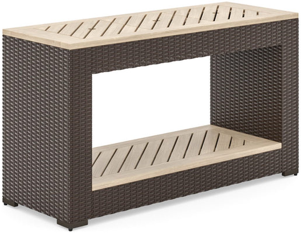 Add stylish storage and create a convenient place to put cups and glasses when entertaining with this Homestyles Palm Springs Sofa Table. Perfect for indoor or outdoor use, the all-weather rattan is hand-crafted by artisans to deliver solid performance year after year.Read More