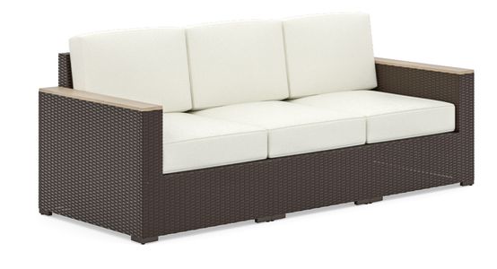 Instantly transform any size patio, balcony or deck area into an inviting, comfortable haven with the Palm Springs collection three-seat sofa. Built for indoor or outdoor use, this sofa is built to withstand the elements, from the weather-resistant rattan to the fade-free cushion fabric. Cozy cushions deliver lasting comfort and the covers easily unzip to clean. Solid acacia wood arms combine style and durability to keep your outdoor refuge looking sharp season after season. Combine other Palm Springs collection items to complete your vision for the great outdoors. 3-Seat Sofa measures 33"H x 80.5"W x 32"D.Read More