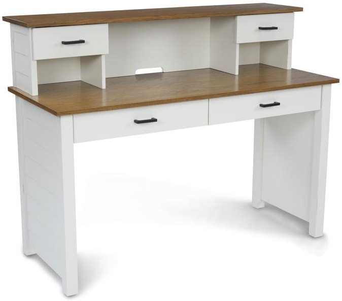 Classic coastal New England styling with shiplap detailing. The Portsmouth Desk with Hutch by homestyles is crafted from poplar solids, with a top of oak veneer and engineered wood. The desk and hutch feature an off-white painted finish with brown oak-stained tops. The desk has a generous work surface with two lower storage drawers. The hutch features two pigeon-hole drawers and a center cut-out in the lower back panel for electrical cord access. Both pieces feature metal drawer pulls finished in aged antiqued nickel and side panels with shiplap detailing. Finish and measurements may vary slightly. Assembly required. Arrives at your door by parcel delivery service.