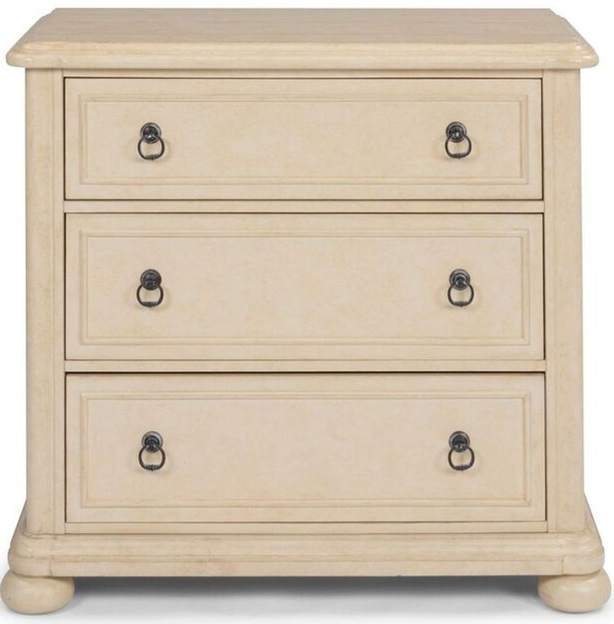 French farm-house design with hand applied aged Antiqued White painted parchment finish. The top, and side panels are finished to have an aged plank look, giving it an old-world look. The top also features a shaped, multi-tier edge, as does the base molding. Crafted of mahogany solids and mahogany veneers, with engineered woods. The front upright frames are shaped to match both the shaped carved top and base. Drawers feature detail molding for added design element and have aged nickel finished ring style drawer pulls. The top drawer features a felt bottom to protect more delicate clothing items. The design is completed with 4 bun feet. Note finish and measurements may vary, assembly required.