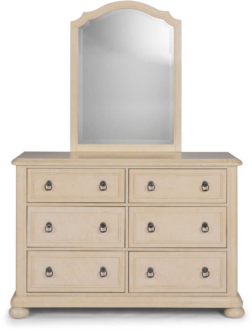 French farm-house design with hand applied aged Antiqued White painted parchment finish. The dresser top, and side panels are finished to have an aged plank look, giving it an old-world look. The top also features a shaped, multi-tier edge, as does the base molding. Crafted of mahogany solids and mahogany veneers, with engineered woods. The front upright frames are shaped to match both the shaped carved top and base. Drawers feature detail molding for added design element and have aged nickel finished ring style drawer pulls. The top 2 drawers feature felt bottoms to protect more delicate clothing items. The design is completed with 4 bun feet. The Mirror frame is crafted of solid mahogany, and features, carved beveled inner edge, and carved shaped top, with shaped beveled edge mirror glass. Comes complete with mounting brackets to attach to the dresser, or with attachments to allow hanging on the wall. Arrives to your door by parcel delivery service. Note finish and measurements may vary, assembly required. Dresser: W-54”, D-19”, H-36”; Mirror: W-28”, D-3/4”, H-38”