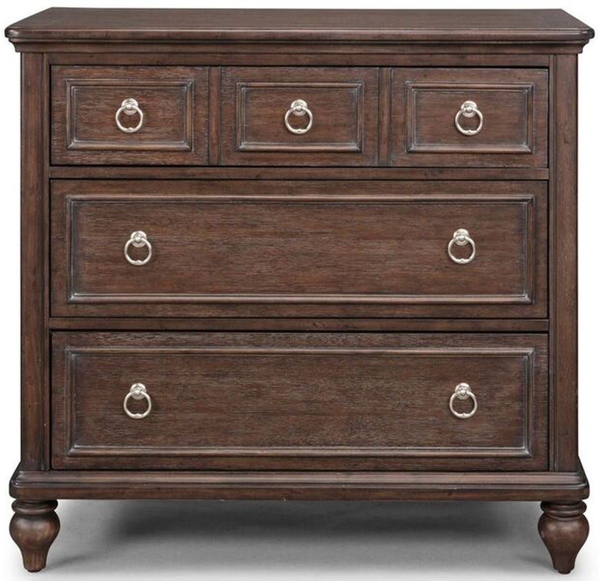 The chest features a top drawer that has faux 3 drawer front design, but is one single drawer, with felt lined bottom to protect more delicate items. Lower 2 large drawers provide deep drawer storage, with all drawers feature nickel finish ring style drawer pulls.