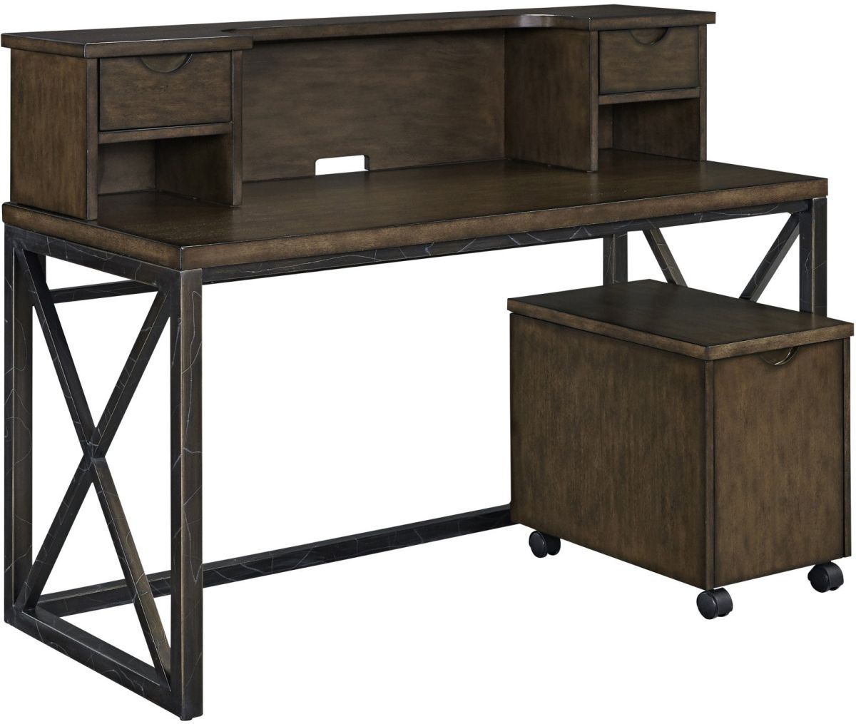 Contemporary design partners with simplicity and function in this Xcel Desk with Hutch and File Cabinet by homestyles. The desk top, hutch and file drawer are crafted of mahogany wood veneers over an engineered wood core in a cinnamon-colored finish. The desk's metal tube frame in a distinctive, aged copper powder-coated paint finish has raised abstract gold highlighting. The X-frame design on the side panels add interest and stability. There are additional upper and lower frame supports for added strength. The file cabinet features a carved finger-pull-lift lid that opens to a storage area for either letter- or legal-sized files, with an additional raised box storage area. There are four casters (two locking) for easy mobility. The hutch has two top drawers with carved finger pulls for letter storage, with pigeon hole areas below and a center area with wire management access.Read More