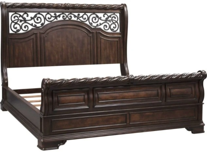 Indulge in the elegancy of the Arbor Place sleigh bed. Crafted with poplar solids and birch veneers and metal, this piece features a unique rope twist cap rail, bolt on rail system, center support slat system, and a unique scrolled headboard insert finished in brass metal.Read More