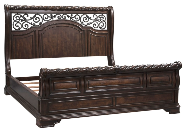 Indulge in the elegancy of the Arbor Place sleigh bed. Crafted with poplar solids and birch veneers and metal, this piece features a unique rope twist cap rail, bolt on rail system, center support slat system, and a unique scrolled headboard insert finished in brass metal.Read More