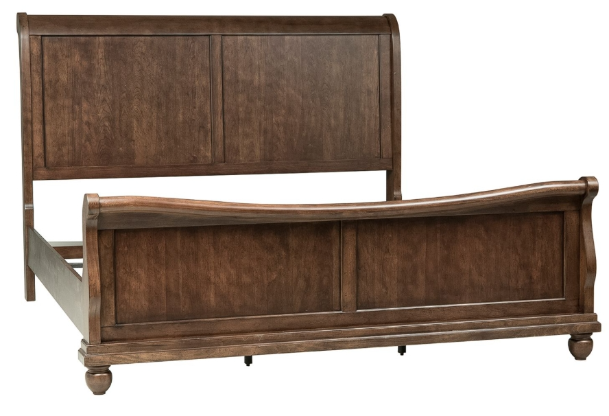 Invite this casual yet traditional Rustic Traditions sleigh bed into your home. The rustic cherry finish enhances the classic Louis Philippe styling of the bed. Make a statement with the rolled back headboard and a footboard that features a rolled cap rail, creating a nice motion.Read More