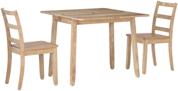 When not in use, the table top folds down to create a compact footprint ideal for smaller dining areas, apartments, or breakfast nooks. The set includes two matching ladder-back chairs with solid wood seats that complement the table's timeless design. Crafted with quality construction and clean lines, this dining set seamlessly blends functionality with traditional charm.