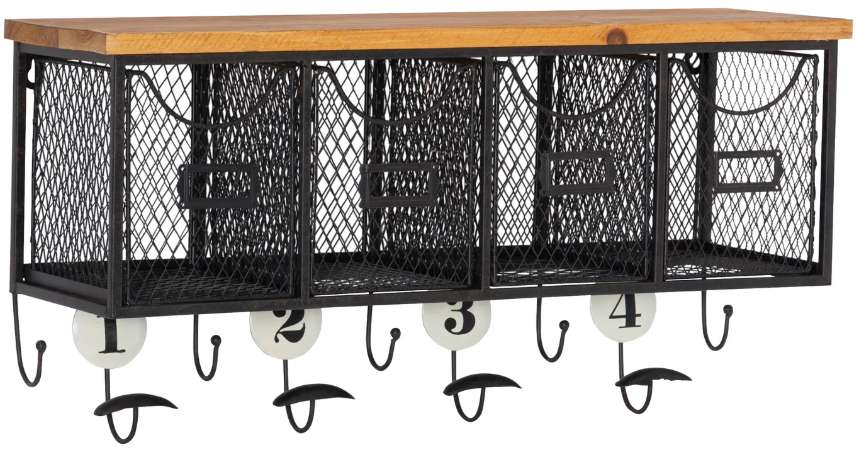The four basket wall organizer will add storage to an area while saving valuable floor space. Four grid style metal baskets provide room for storing a variety of items. Nine storage hooks allow you to hang coats and bags. An antiqued stained wood top provides an additional area to display items.Read More