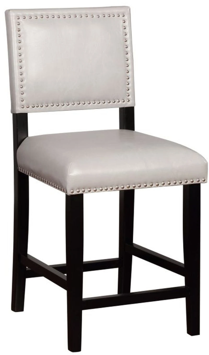 Add color and seating to your kitchen or dining space with the Brook Stool. Crafted from sturdy hardwood, the stool features bottom footrails for added stability and durability. The black finish is accented by a Dove Gray upholstered seat and back. Shiny silver nailheads add extra interest.Read More
