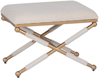 Add a polished touch to any space with this sculptural accent stool. The cushioned seat is upholstered in a soft oatmeal cotton weave that lends a light, tailored presence. Below, a gold-finished iron base forms an elegant X-shape, hand-wrapped in matching oatmeal rope for a subtle interplay of shine and texture.Read More