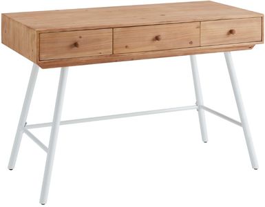 Sleek contemporary styling brings together the look of natural wood with sturdy iron base finished in black. Three slide out storage drawers provide ample organizational space. A large smooth workspace top is ready to take on any project.Read More