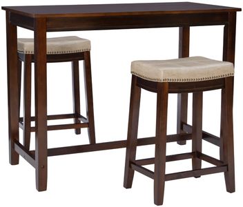 Make a bold statement with this elegant 3-piece counter set, both timeless and highly functional in tight quarters. The streamlined pub table in a rich brown stain provides a sleek and sturdy foundation, while the two matching counter stools offer a subtle pop of color with their mottled beige faux leather upholstery.Read More