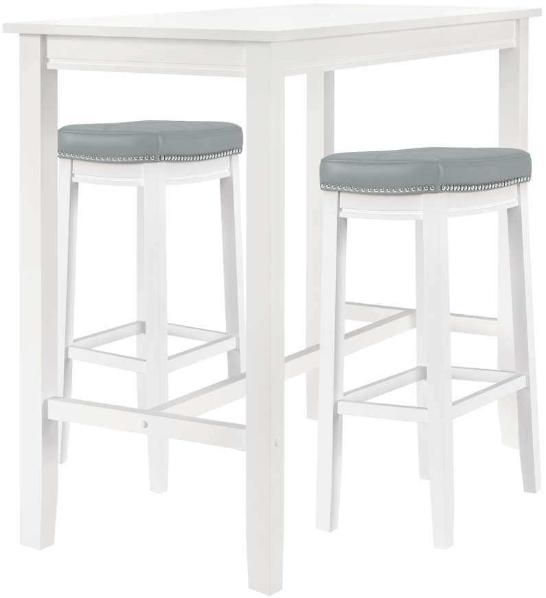 Two matching stools, upholstered in grey faux leather with double-needle stitching, offer plush comfort with a refined touch, accentuated by silver nailhead trim. Crafted with compact frames, this space-saving ensemble is perfect for cozy kitchens, apartments, or open-concept living spaces. Whether hosting a group brunch or enjoying a quiet evening drink, it transforms any dull corner into an elegant retreat.