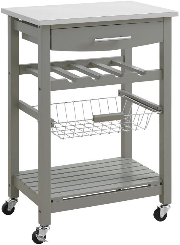 A perfect spot to prep with style to spare, this efficient kitchen cart brings modern charm to kitchen and entertainment settings. For storage, a pull-out drawer, wire basket and bottom shelf provide ample space to stash utensils, fruit, serveware and more.Read More