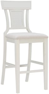 The Duncan bar stool has a white finish to give it a rustic and vintage appeal. The eye-catching back draws attention with its swooping sides, straight lined top rail and hand woven rattan center detail. The easy to maintain seat is upholstered in 100% polyester fabric that mimics the look of a beige linen.Read More