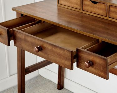 The Emery Vanity Set features a tilt mirror, adjustable to create the perfect angle for all styling needs. Three top drawers have finger pull cutouts and three base drawers with wood knobs provide ample storage space for items such as makeup, jewelry and hair brushes.Read More