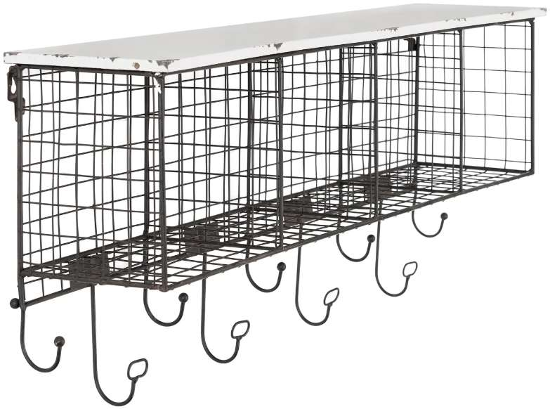 Organize in style with this charming four cubby wall shelf featuring a rugged industrial design and ample storage space. Four spacious cubbies keep smaller items organized while nine hooks keep coats, hats, and bags hung neatly. A white distressed top adds display space for decorative accents. Add this piece to a hallway, mudroom, or entryway for handsome look and versatile use.