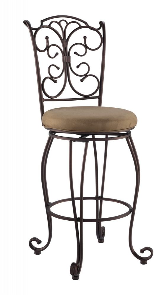Sophisticated and intricate curves give this bar stool an elegant, traditional look that elevates the design of any home. Bring a distinctive look to your kitchen, home bar, or dining area with this stool and enjoying the sturdy, long-lasting beauty of a metal frame. A padded seat, foot rests, and smooth swivel motion offer exceptional comfort making this piece sumptuous in both look and feel. Choose from two heights for the ideal fit for your space.