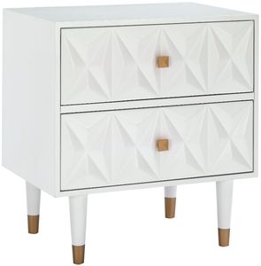 With its geometric patterned front, the Geo White Nightstand will add texture and depth to your space. The nightstand has a full textured geometric front accented with square gold hardware and round, gold dipped legs.Read More