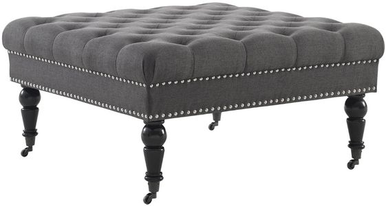 The Square ottoman is a stylish and versatile addition to your home's decor. Perfect for use as an ottoman or coffee table, the piece has a tufted top upholstered in a linen fabric. Silver or brass nailheads accent the side, while turned black or natural finished legs complete the piece.Read More