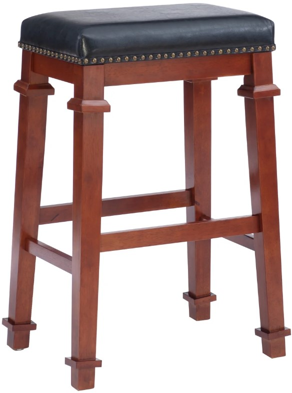 Add traditional seating to your bar, counter or high top table with this backless stool. Crafted from the wood, the stool features splayed legs accented by decorative wood trim. Choose between a bar or counter height, and a cherry finish with a black faux leather cushion.Read More