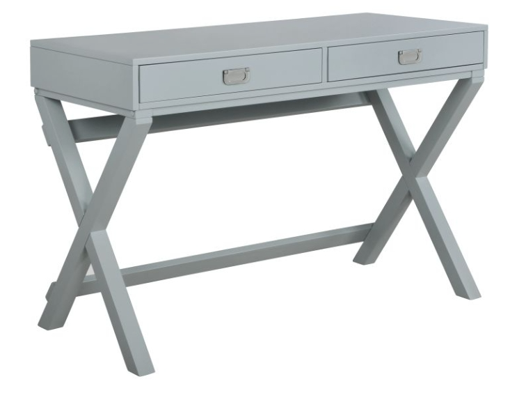 Make work fun with this campaign style writing desk. Finished in grey with silver hardware, this desk will add color and life to any space. The x-framed legs provide a study foundation for a work space. Two drawers provide ample space for supplies.Read More