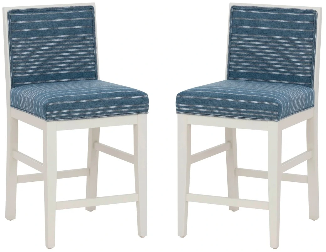 Refresh your kitchen island or breakfast bar with this set of 2 upholstered counter stools, proudly made in the USA from solid maple wood. The white painted frame brings a crisp, clean foundation while the blue woven polyester upholstery adds rich color and textural contrast.Read More