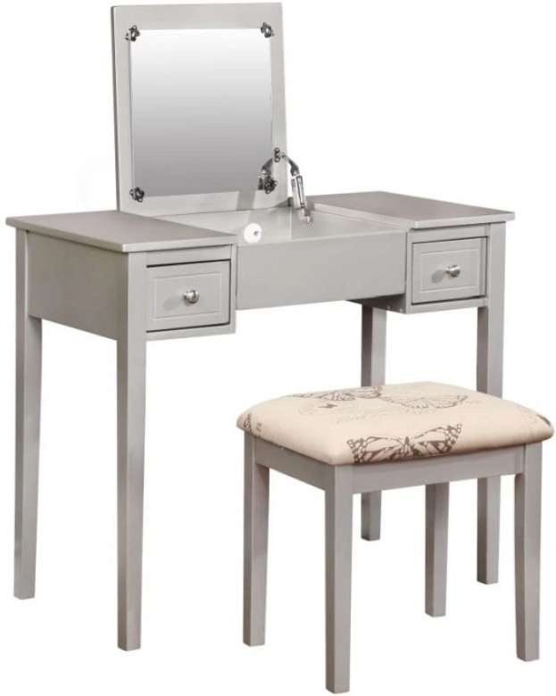 Flip down front panel for easy access to your possessions. The vanity is complimented by a thickly padded upholstered stool. Ideal for teens and adults. Some Assembly Required Enhance your day with this elegant vanity set featuring classic lines, ample storage, and a gleaming silver finish. Timeless yet functional, this piece includes two drawers and a flip top that opens to reveal both a mirror and a large storage compartment to accommodate all your make up, jewelry, and beauty tools. Ideal for a bedroom, master bathroom, or dressing area, this vanity set includes a matching padded stool upholstered in butterfly fabric.