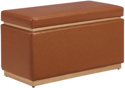 Out of sight storage, style, and comfort come together as one to form this versatile ottoman. The padded exterior is upholstered in caramel faux leather, offering a welcoming seat or footstool for two to kick up their feet without overcrowding.Read More