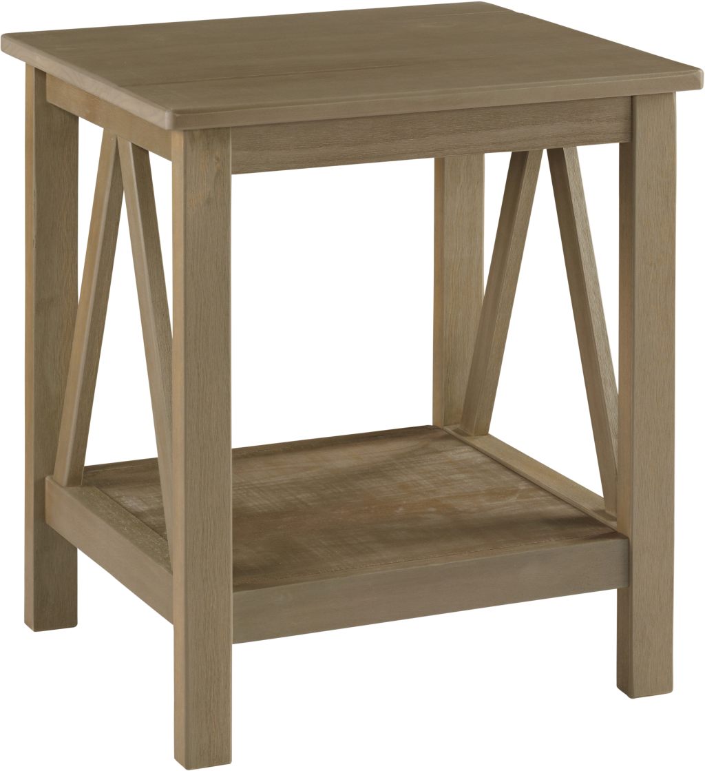 Classic yet distinctive, this side table utilizes sharp, linear design to create an eye-catching look. The soft driftwood finish lends natural warmth while the two tier design offers versatile display and storage space that enhances any home. Design your ideal living room collection by pairing this piece with others in the collection. Durable construction ensures years of beauty. Available in two colors.