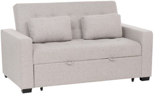 Crafted from a durable blend of rubberwood and plywood, it provides lasting stability, while the woven polyester upholstery in grey adds a sleek, modern touch. With its tufted backrest, this sofa brings a touch of elegance to any room, while offering the perfect spot for lounging or entertaining guests. The 400 lb weight capacity ensures reliable support, and the seat height of 20" makes for a comfortable seating experience. When you need extra sleeping space, simply pull out the bed using the sturdy handles, effortlessly transforming your sofa into a cozy bed. This set also includes two accent pillows for added comfort and style. Perfect for small spaces, this sofa bed combines practicality and sophistication in one beautiful piece.