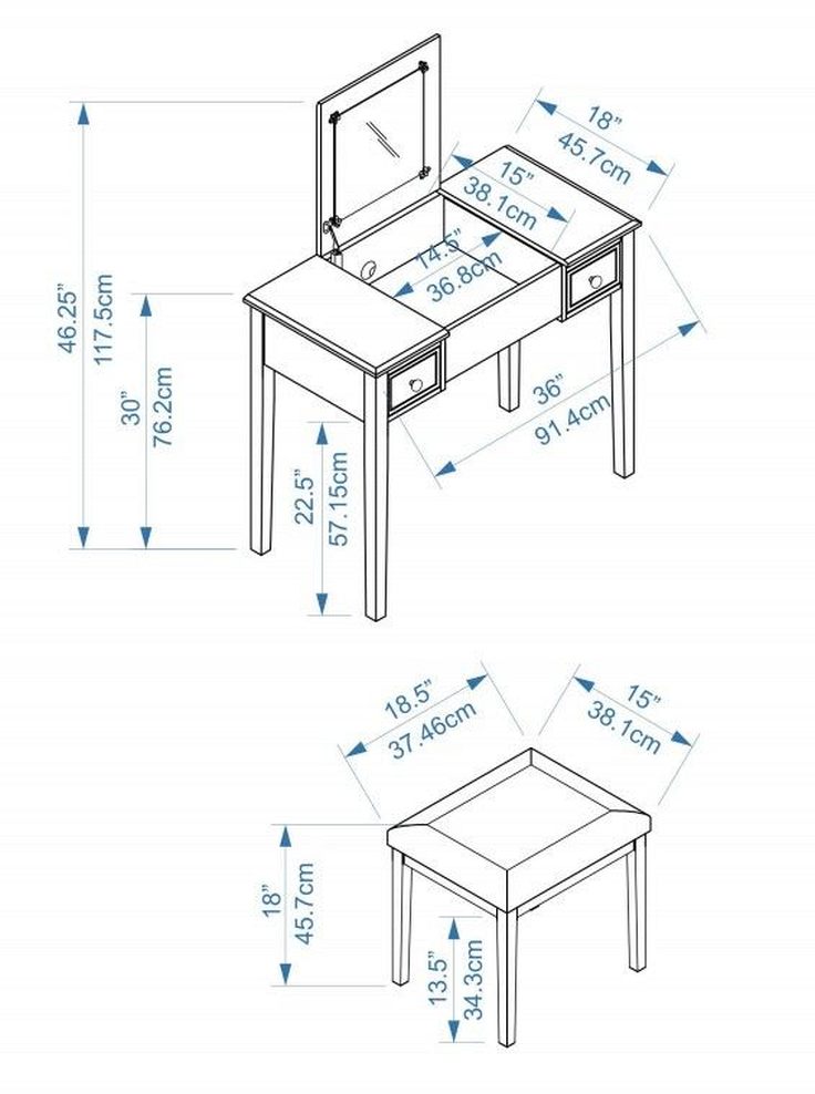 Vanity: 36" x 18" x 30" 37.48 lbs. ; Stool: 18.5" x 14.5" x 18" 7.7 lbs.