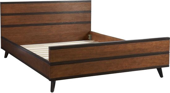 Clean lines and angled legs combine to form the Mid Century Platform Queen Bed. The walnut finished streamlined frame is accented with dark striped details. Bed includes headboard, footboard and side rails.Read More