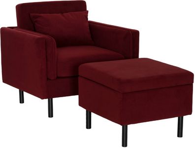 The matching ottoman (24.25” L x 24.25” D x 19.75” H) provides more than just a place to rest your feet—it opens to reveal spacious storage, perfect for keeping your living area organized. Both pieces are upholstered in luxurious berry velvet, adding a vibrant and sophisticated touch to any room. Constructed from a durable blend of rubberwood and plywood, this set ensures long-lasting use. The black metal powder-coated legs give the set a sleek, modern finish, while the 26” arm height ensures the chair provides perfect support. Combining beauty with practicality, this chair and ottoman set is the ideal addition to your home.