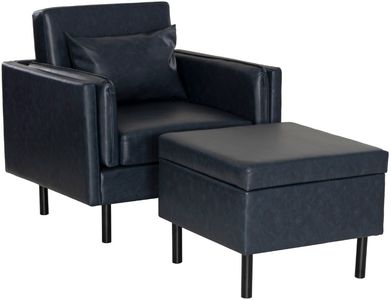 The matching ottoman (24.25” L x 24.25” D x 19.75” H) offers more than just a place to rest your feet—it opens to reveal spacious storage, perfect for keeping your living area organized. Both pieces are upholstered in luxurious navy faux leather, adding a touch of sophistication to any room. Constructed from a durable blend of rubberwood and plywood, this set promises long-lasting use. The black metal powder-coated legs give the set a sleek, modern finish, while the 26” arm height ensures the chair provides the perfect support. Combining style with practicality, this chair and ottoman set is the ideal addition to your home.