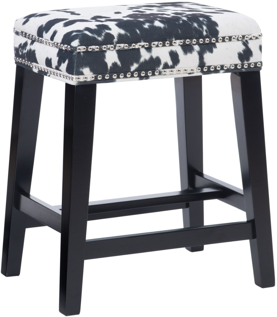Traditional in style and design, this stool is a stylish addition to a kitchen or bar. The black or brown wood finish is accentuated with a matching cow print plush upholstered seat and embellished with a shiny silver nail head trim. Completing the stools structured design are four added footrails for stability.Read More